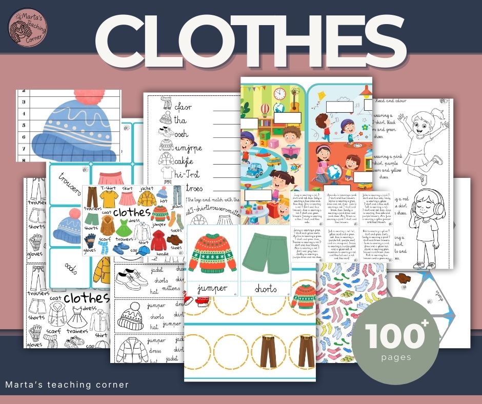 CLOTHES – English Vocabulary Activities to rozbudowany zestaw materiałów do nauki i utrwalania słownictwa związanego z ubraniami, przeznaczony dla przedszkola oraz klas 1–4 szkoły podstawowej.
