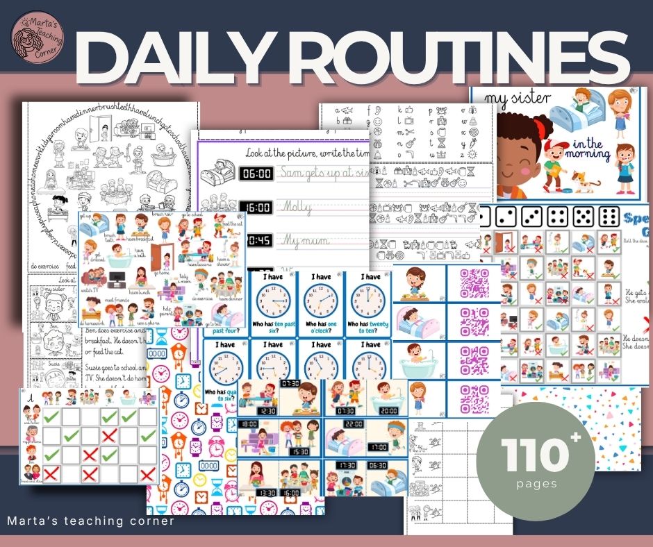 Daily routines and time worksheets ESL for preschool and grade 1–4 learners. This printable set includes flashcards, worksheets, speaking activities, games and time practice.