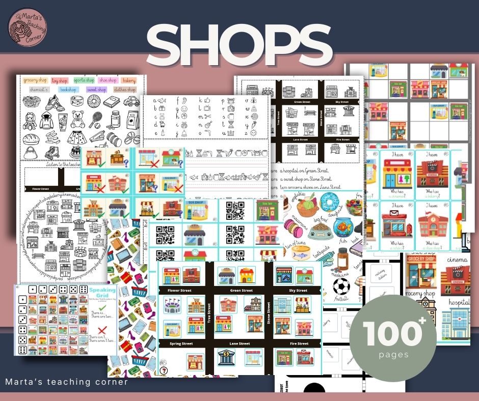 Ten zestaw powstał po to, żeby lekcja o sklepach i miejscach w mieście była dynamiczna, angażująca i pełna mówienia. Zamiast pojedynczych kart pracy dostajesz kompletny pakiet materiałów, który pozwala prowadzić zajęcia od wprowadzenia słownictwa aż po gry językowe i zadania komunikacyjne.